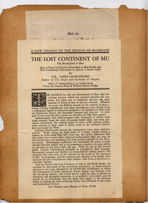 The following advertisement was contained in one of James’ scrapbooks (reproduced in the Lost Gems of the Lost Continent of Mu in pdf or ePub format.)