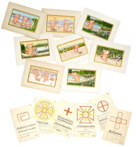 Occultist James Churchward is best known for his books on the lost continent of Mu, which according to him “extended from somewhere north of Hawaii to the south as far as the Fijis and Easter Island.” Over a decade into his retirement after receiving a settlement for patent infringement on NCV steel, he published the first book on Mu: The Lost Continent of Mu Motherland of Man. FIve more were to follow. The material here was all sent to two young women he had met and befriended on an ocean voyage. The illustrations are mostly colorful and whimsical, many depicting his own primitive Pixey characters engaging in various activities including fishing, one of Churchward’s favored pastimes, sports, and various frivolities, but also some related to his occultist work like the notes on ancient symbols. An interesting archive that should be seen.