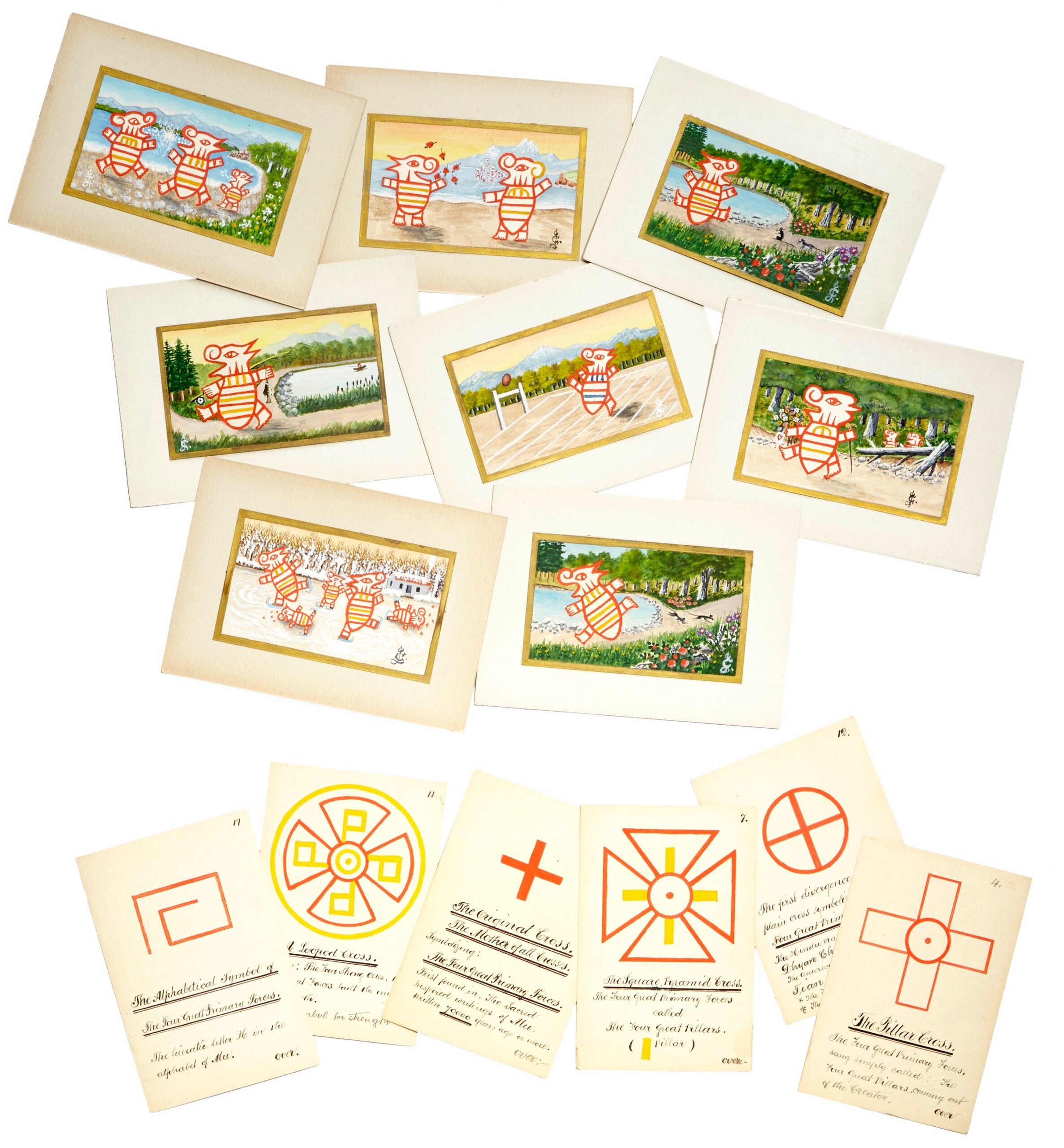3. “Symbols of the Four Primary Forces. ‘The Sacred Four’,” ink and gouache on 25 cards, [no date], being detailed descriptions of various symbols with gouache depictions, toned, lacking some of the series.