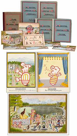 The collection consists of five quarto volumes: each handwritten in ink and illustrated with gouache paintings (totaling 272 foliated leaves with 96 full-page paintings of individual Pixeyite figures and many other painted illustrations); four sets of satirical gouache paintings, most of which depict the Pixeyites engaged in all sorts of outdoor “sports” and “frolics” (totaling 72 unique artworks, most on 6” x 9” sheets); and one set of 22 hand-painted “Symbols of the Four Primary Forces.” Also included is a small cache of letters from Churchward to two young ladies whom he befriended a few years before his death in 1936. All of the paintings are signed with Churchward’s hand painted signature or monogram. Many of the individual gouache paintings have manuscript descriptions in pencil on the back. The set of “Symbols” have manuscript descriptions in ink. The five quarto volumes are in painted wraps with quarter cloth backstrips. The first volume (“Atlas”) has a few small holes in the margins of two paintings (not affecting the images), else all five volumes and all of the other artworks are in fine condition.